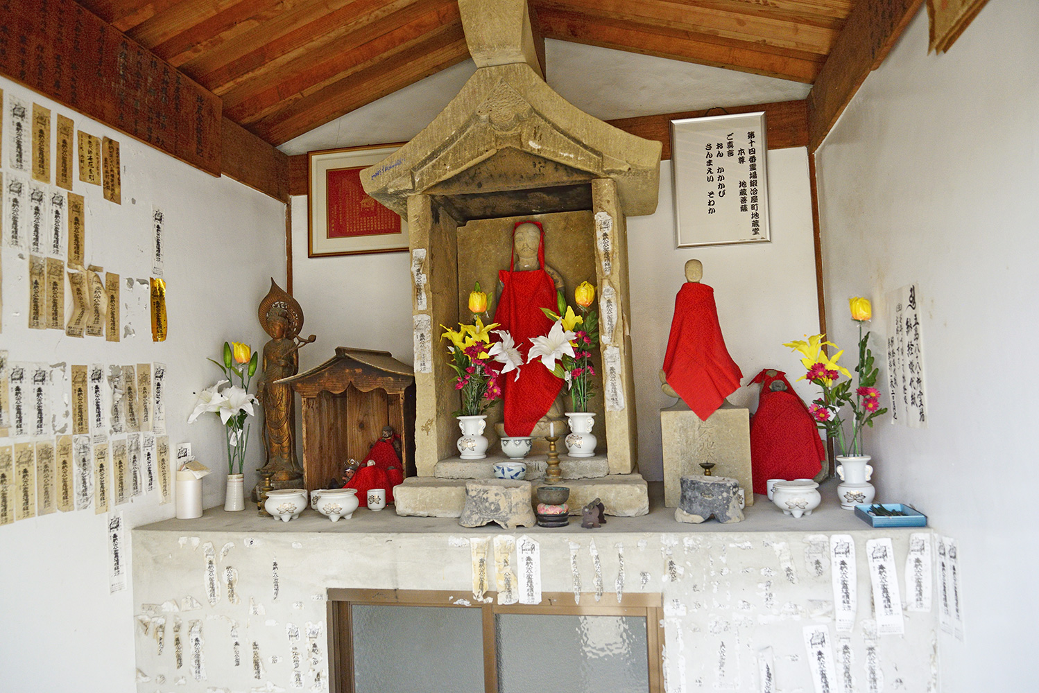 歩いて行く方が分かりやすい。車で行くと一方通行なので回り道するのだが、みちぞいからはみのがしやすいのでゆっくりと。13番札所から見て、酒や脇の道を真っ直ぐ行くと右手に見える◆行事:お大師様(新)4月21日お接待なし
