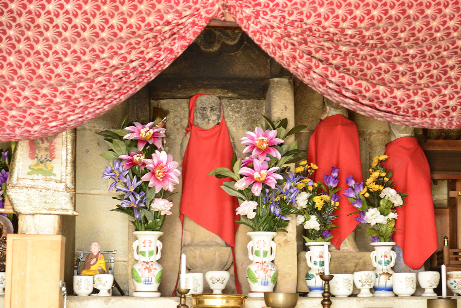 1人の女性によってお世話されている地蔵堂です。毎日お茶や水を替え、線香、ロウソクを準備していますが仏様が多いので大変なようです。