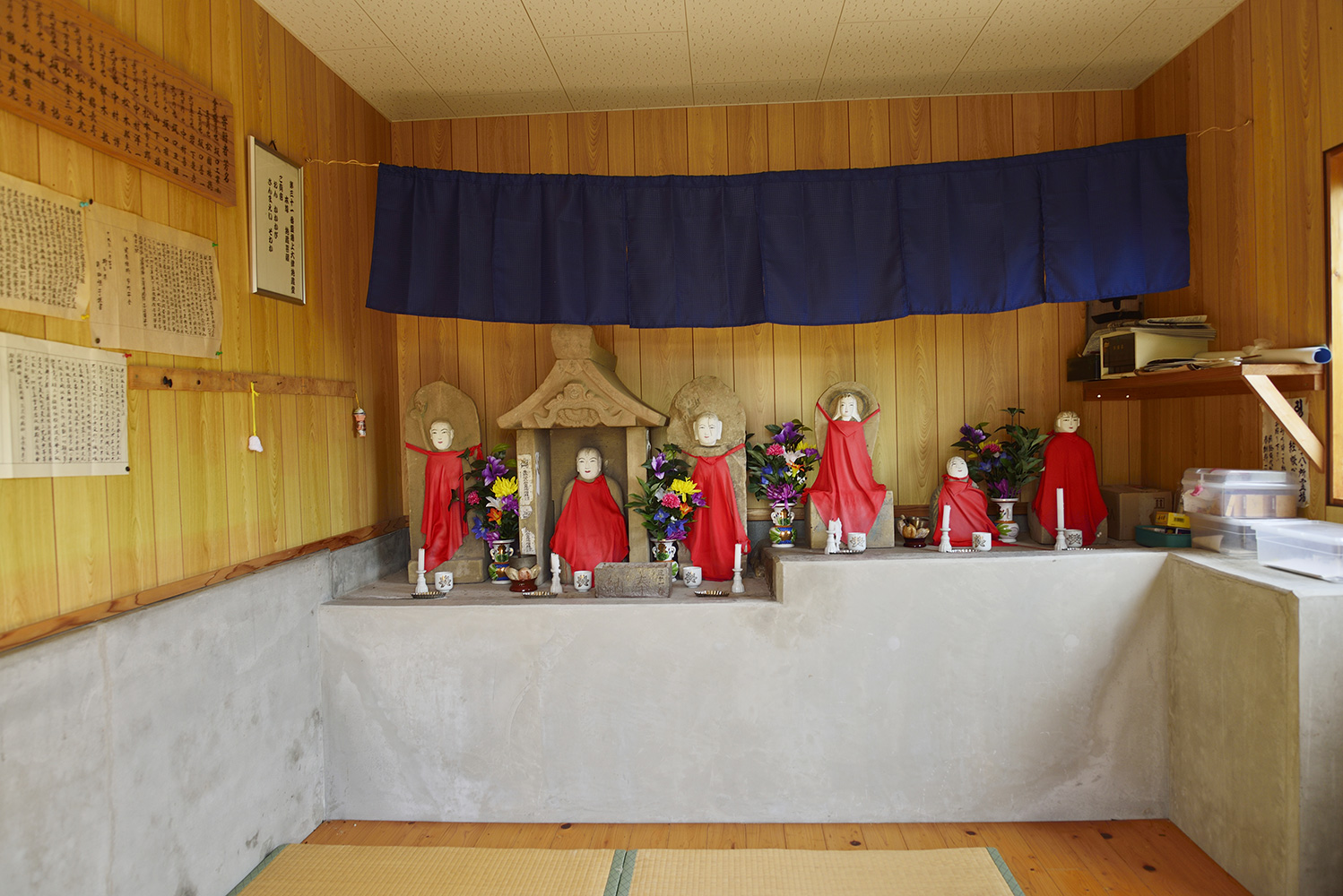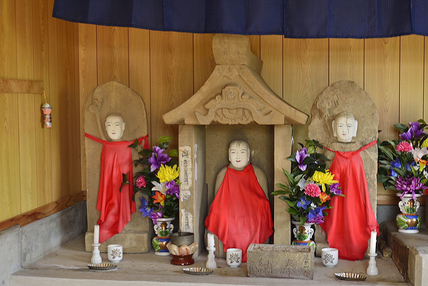 非常に分かりづらい。目印は石神神社と木製ベランダの建物。県道大浜福江線から行くと脇道に入って突き当りに松園商店がある。そこを回り込むようにさらに脇道に入ると、突き当りに石神神社があるので、この周辺にある。◆行事:お大師様(新)4月21日接待あり
