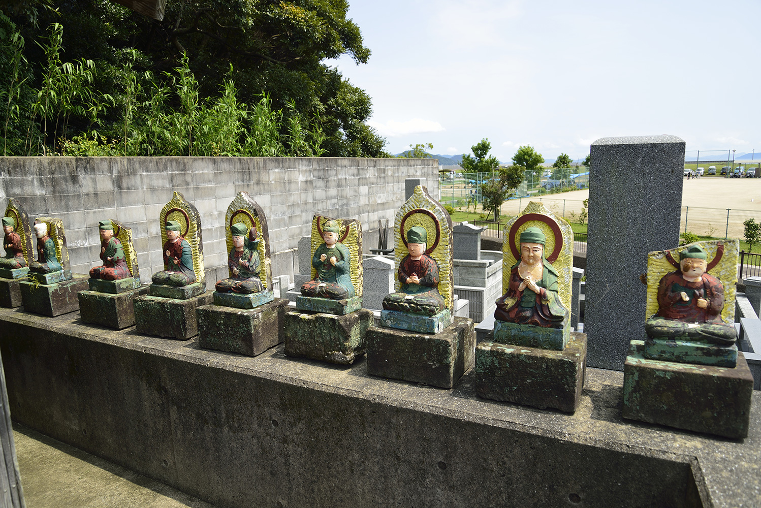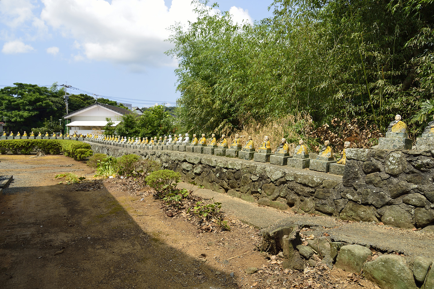 47本尊の阿弥陀如来がもと八幡神社の御本地仏であったので、山号に「八幡山」がつく。奥の院には弘法大師像や13仏が安置されている。また境内外郭には信徒がめいめいに一体ずつ寄進した88ヵ所にちなんだ88の大師像が並び置かれている。
