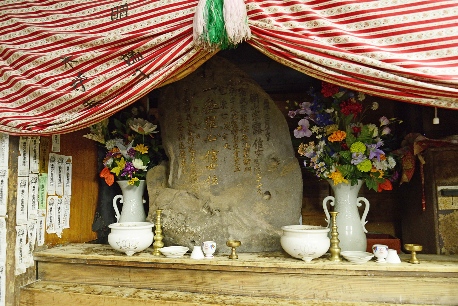 旧の3月21日はお大師さんの日ですが、特別な接待はありません。おばあさんたちが集まって普段するようにご詠歌をあげたりするだけだそうです。この地蔵堂は50年ほど前、県道を作るということで、そっくりそのまま今の位置に移動したそうです。その際、1間ほど小さくなりました。