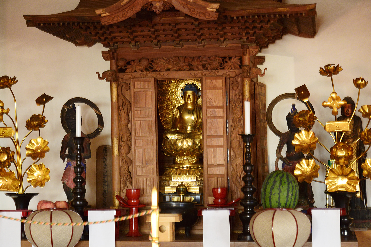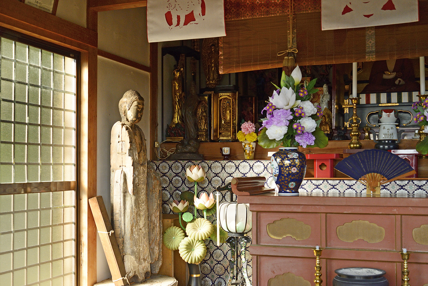 明治初期、西光院の廃寺を最後にお寺のなかった大浜地区は遠い吉田村の明星院に先祖の供養や葬祭をお願いしていたが大変不便であったという。そのため、いろいろ協議がなされ高野山ですでに廃寺となっていた来迎院を当地に招聘(しょうへい)することになり、境内となる田畑はすべて檀信徒が寄付してくれたので実現した。1809(明治23)年のことである。大浜地区住民の約9割は真言宗信徒である。1916(大正5)年新四国88ヵ所の石像が、昭和末期にはボケ防止に効験ありといわれる観音像が境内に安置された。
