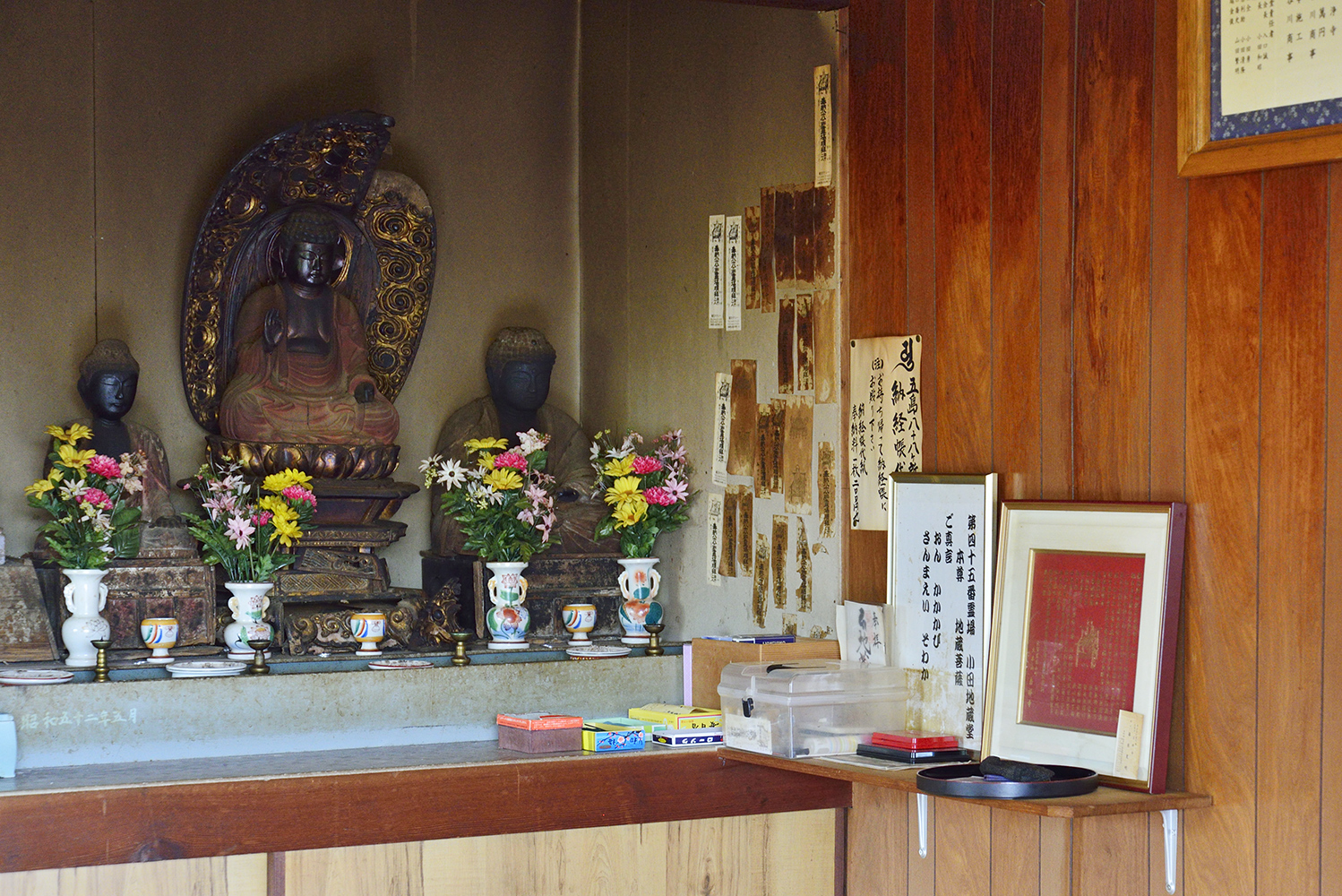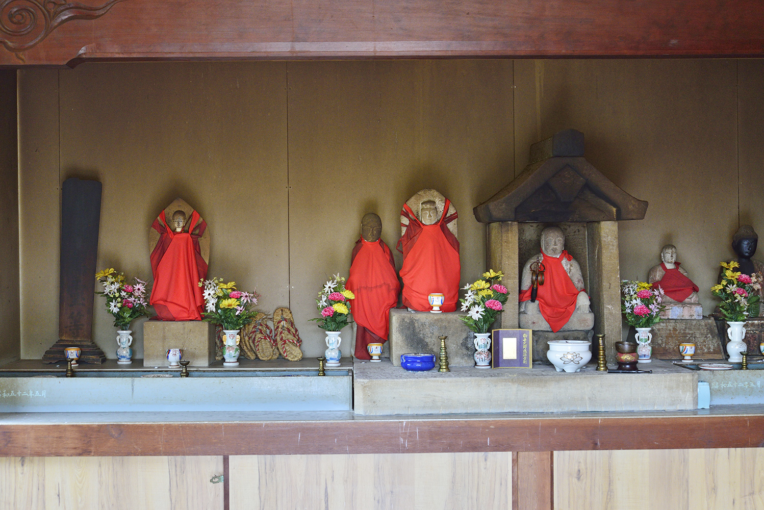 9月15日は「おとや」、9月23日は「お地蔵の日」といって、10数名がもち米の団子を作って集まり、それをお供えしてお話しをしています。向って右側の仏様3体(黒色のほとけ)は盛興寺から持ってきたといわれており、8月11日には清浄寺から住職に来てもらい、施餓鬼をおこなうということです。