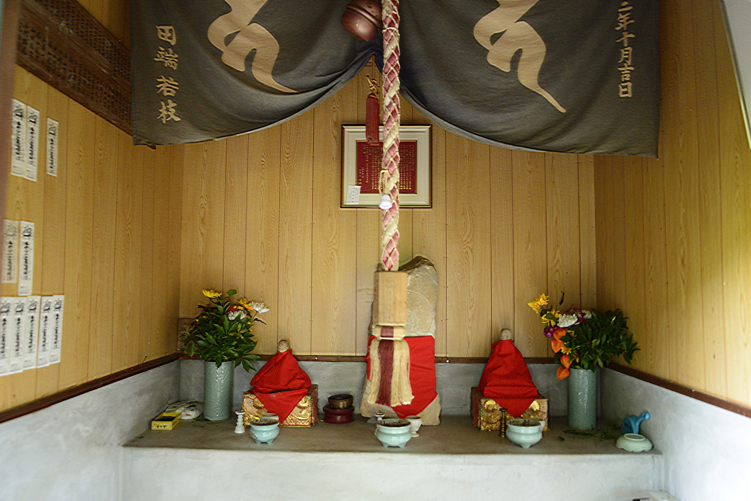 ここの地蔵堂も特定の高齢者の女性によって維持管理されています。地蔵堂の世話をはじめて40年になるということです。普段は月に数回水を替えたり、線香、ロウソクを点てたりしています。そして正月とお盆には新しいエプロンに替えます。今月(12月)も27日ごろに着替えさせて、お花も取り換えるつもりだそうです。地蔵堂のお世話はお地蔵さんのためというより自分のためにしているということです。誰かがしないとお地蔵さんものどが渇くので女性が水を供えています。