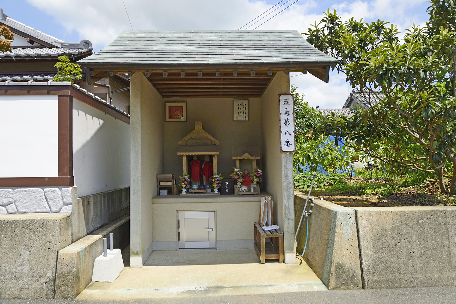 7番札所からだと久木山公民館の交差点を右折して、福江荒川線で右折し、しばらく行くと左手にある。馬責馬場交差点からだと畳店の看板が目印