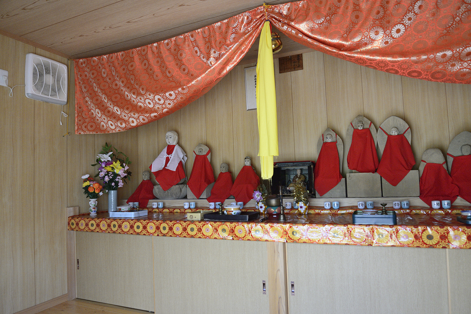 この地区の各家庭はお大師さんの像を持っており、お大師さんの日にはお大師さんに外を見せるため、各家庭では外に向けてお大師さんを飾っているそうです。お接待を受けによその家に行ったり、また自分の家にきてもらったりもします。このとき以外、普段お堂に集まることはないそうです。お堂は新しく去年(2015年)できたばかりですので、お札は壁に貼らないようにしているということです。