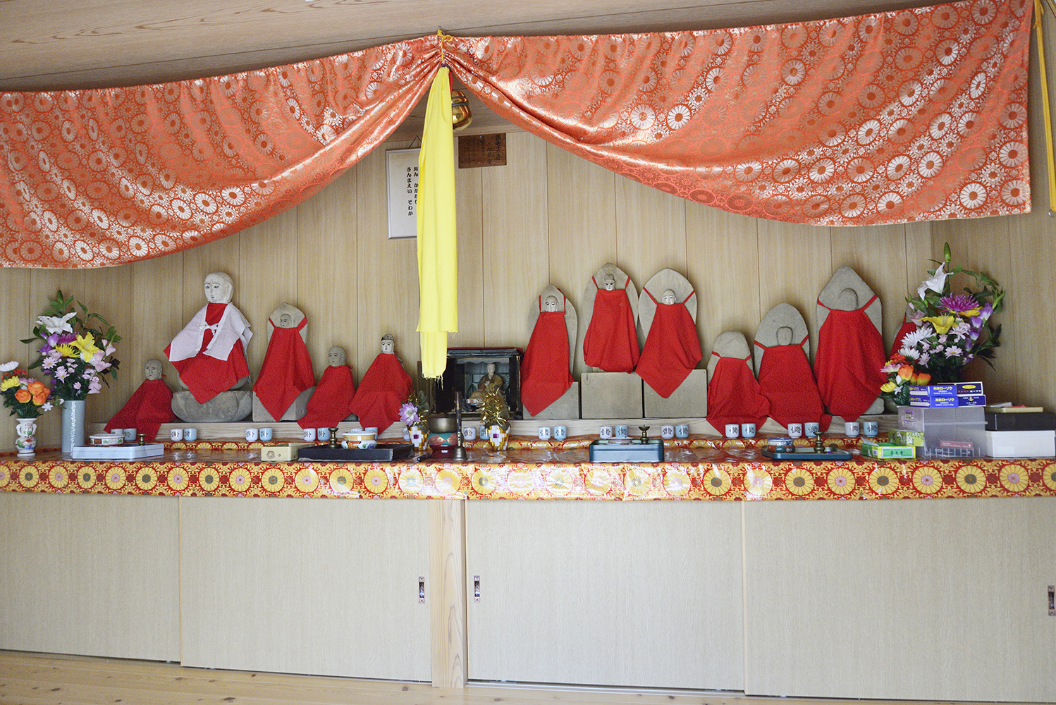この地区は「どうけん」(お堂の上の方)、「地下」(郵便局周辺)、中尾の3地区に分かれています。旧の3月21日には毎年担当地区を決めて、地蔵堂でお地蔵さんを飾って各家庭で料理を作ってお堂に持って行ってお接待をしています。当日は子供たちは10円を持ってお参りに来てくれる(いわゆる「10円参り」)のでお菓子をあげます。大人たちは地蔵堂にお参りして接待を受けて帰りますが、お参りするのは地区の人たちがほとんどだそうです。