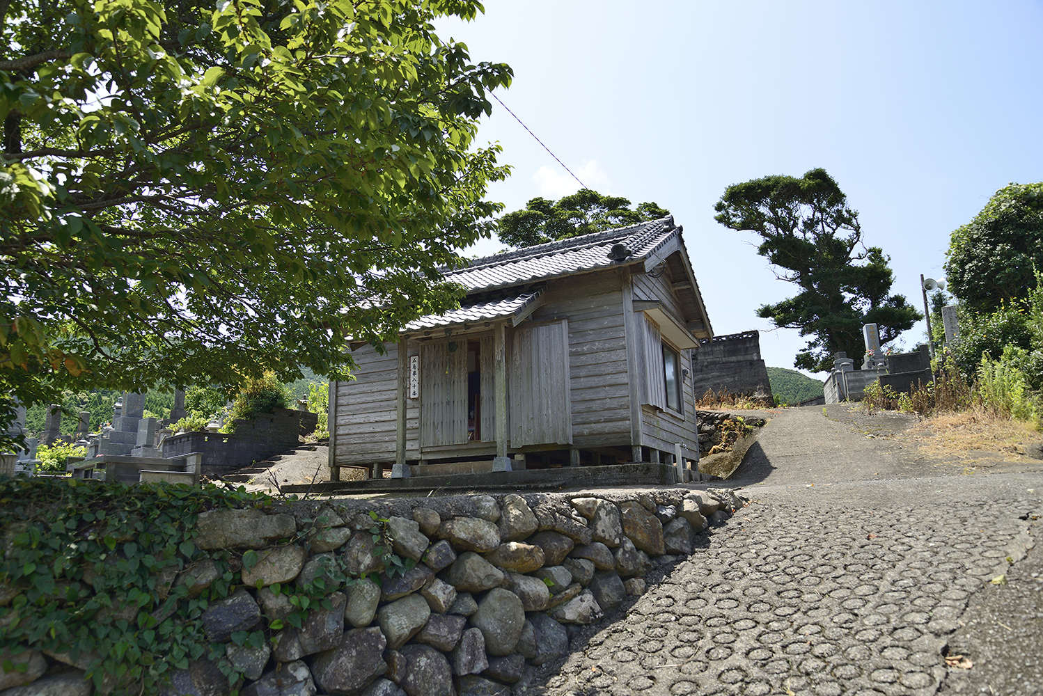 二本楠から玉之浦方面に向かうと国道に合流する。トンネルを越えると 左折する。平成中学校を越えて道なりに進むと丘の裏手に墓地が あるのでその麓にある。